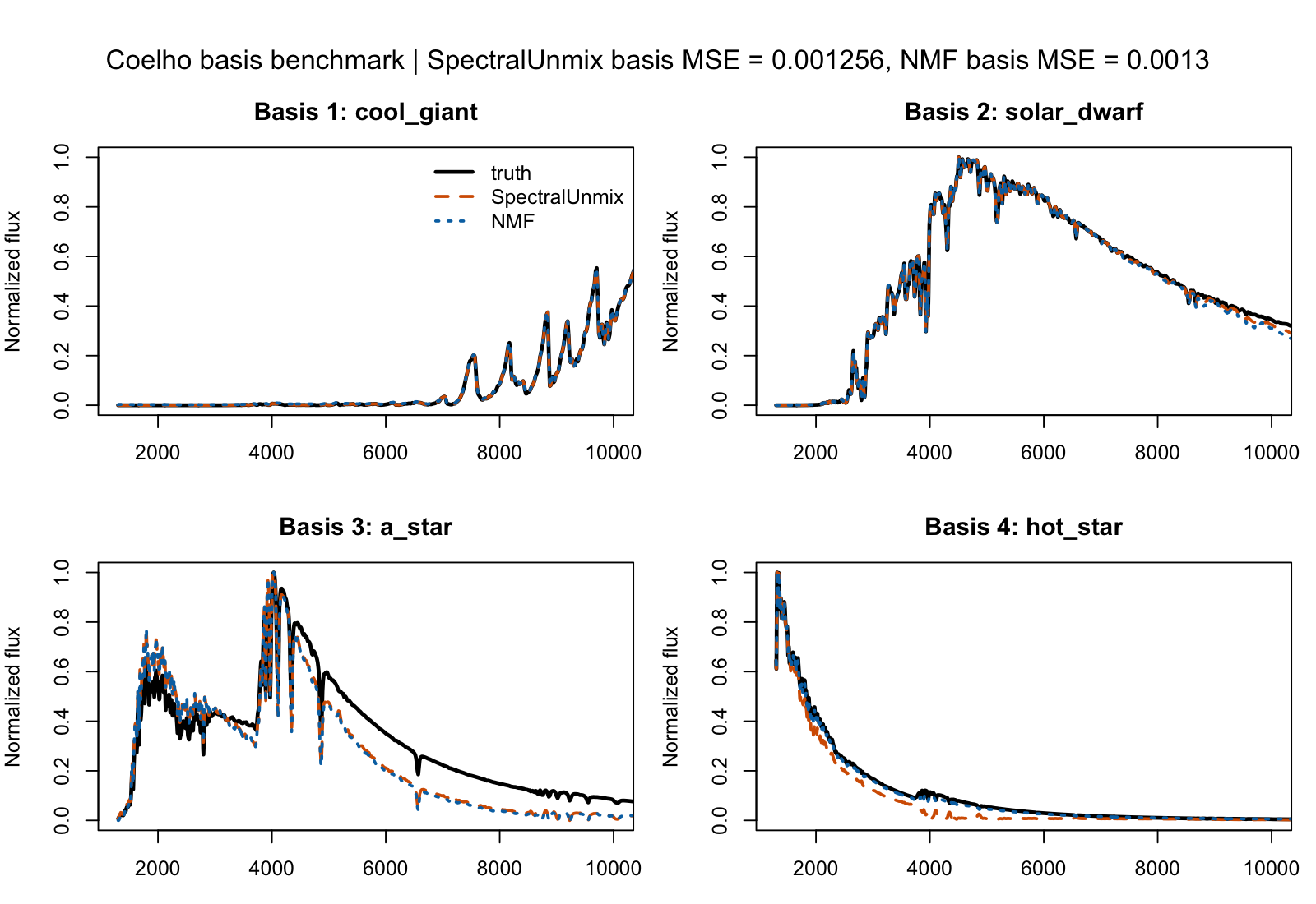 spectral_unmix()fits the model.basis()andcoef()provide NMF-style accessors.fitted(),predict(), andresiduals()provide standard model methods.plot()andplot_reconstruction()provide quick diagnostics.cube_to_matrix()andmatrix_to_cube()remain available for IFU workflows.